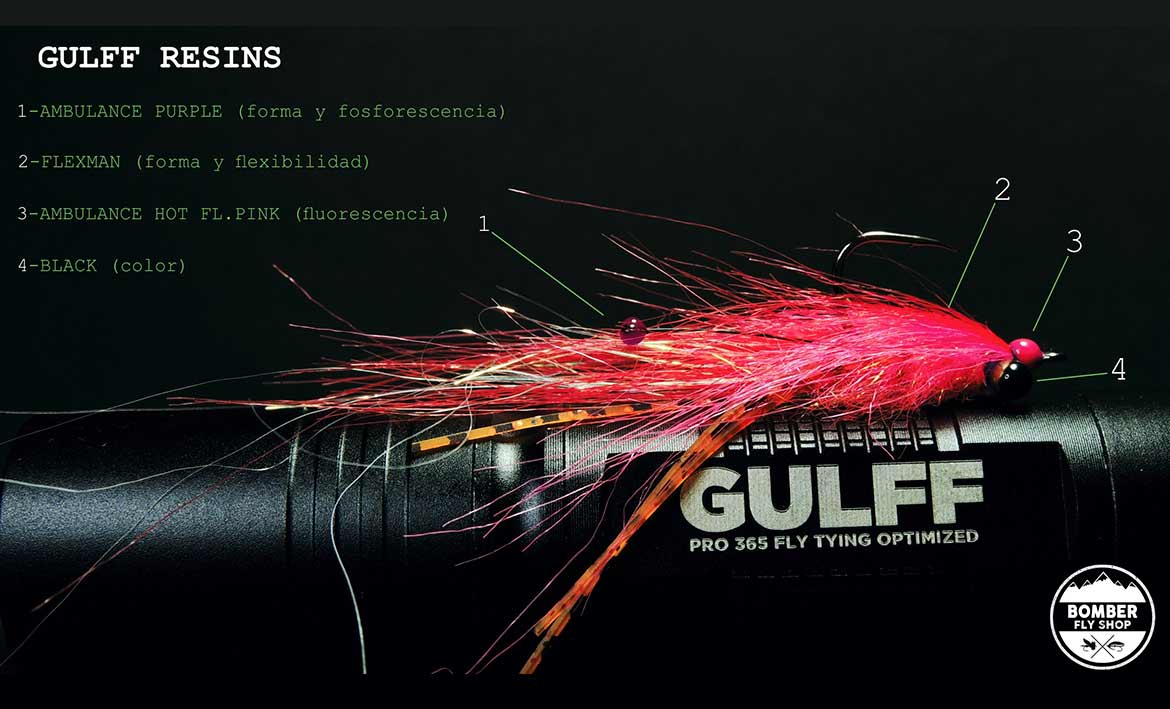 Entre las ventajas que ofrecen las resinas GULFF, se reconoce: 1) curado muy rápido (5 segundos) dejando superficies 100% libre de “Tack” (no quedan pegajosas al tacto), 2) un amplio abanico de posibilidades para lograr las más increíbles moscas desde pequeñas secas o ninfas a grandes streamers. Estas resinas pueden ser agrupadas en distintas series: 1) Clear Resins (Classic, Fatman, Flexman, glowman), 2) Predator Fly Resins (Big Mama, Big Dadd, Big Daddy), 3) Hot Fluoro Colors (FL. Red, Fl. Pink, Fl. White, Fl. Olive, Fl. Chartreuse, Fl. Orange), 4) Ambulance resins (Chartreuse, Pink, Orange, Red, Yellow, Kingfisher Blue, Purple), 5) Hot Dirty Motor Oil Colors resins (Black, Dirty Motor Oil, Amber). Se suma a la lista un barniz de curado UV y un super pegamento. Además es importante aclarar que GULFF cuenta con dos linternas de curado UV (HERO y GULFF PRO 365), cuyas longitudes de onda de 365 nm emitidas por el LED de estas linternas (únicas en el mercado) activan de manera óptima el fotoiniciador de las resinas.